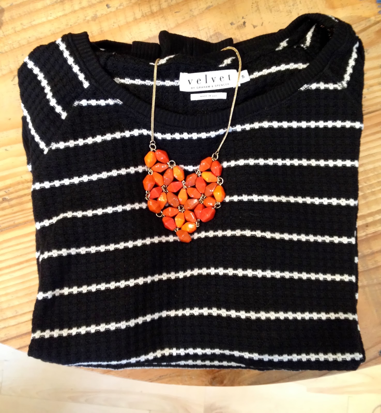 Great new arrivals from Velvet. Dress and tank in the India Challis print and the Becky sweater in black & white stripes!